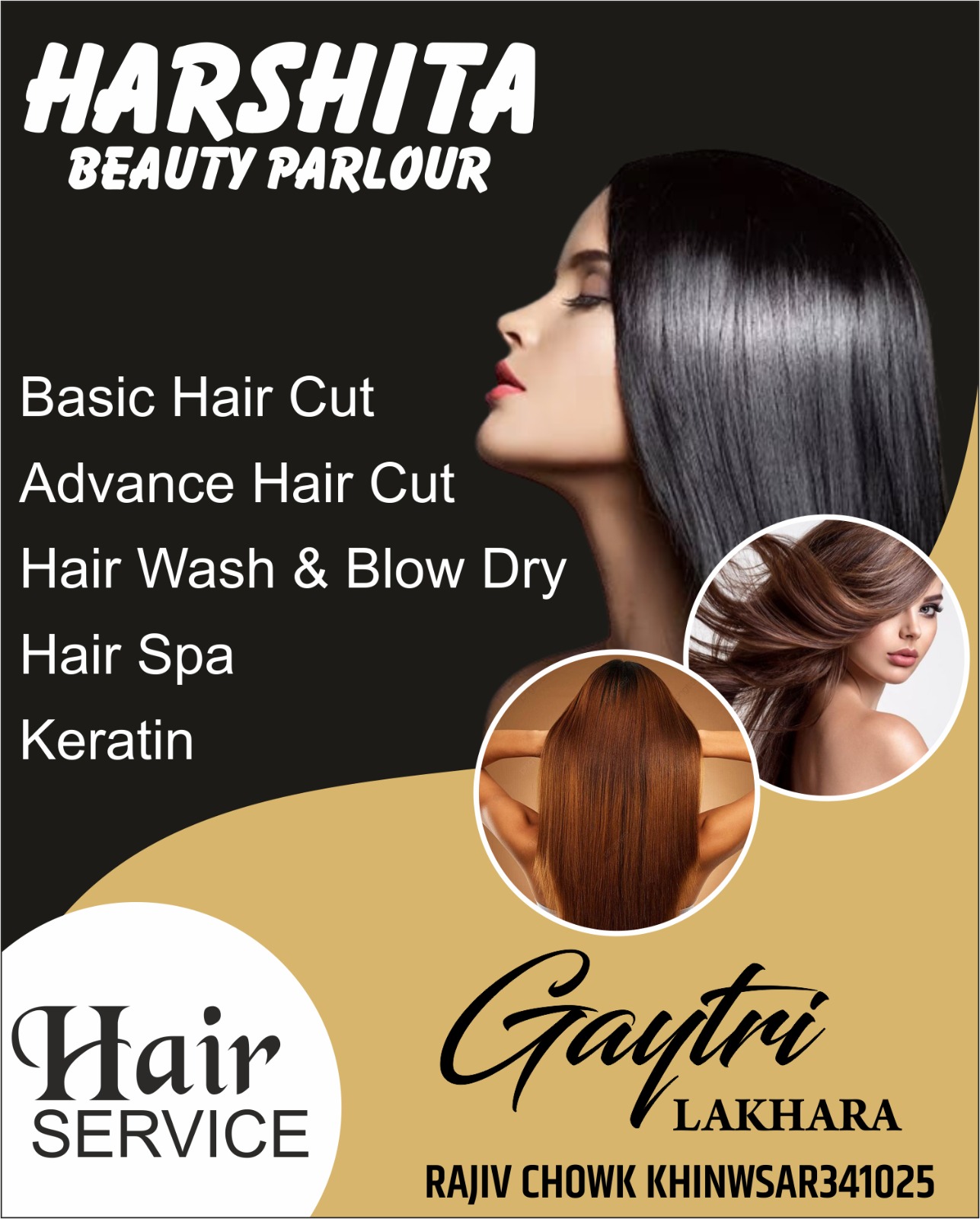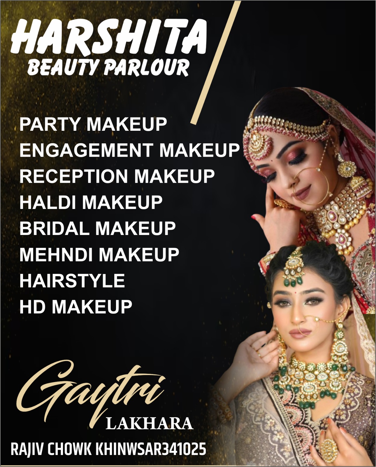 About Us: At Harshita Beauty Parlour, Khinwsar, we offer professional beauty and hair services to help you achieve a flawless and confident look for every occasion. Led by expert makeup artist Gaytri Lakhara, we specialize in Bridal Makeup, HD Makeup, Party Makeup, and pre-wedding looks including Engagement, Haldi, and Mehndi Makeup. Our services also include advanced Hair Care such as Basic & Advance Haircuts, Hair Wash & Blow Dry, Hair Spa, and Keratin treatments for smooth and healthy hair. We provide complete Skin Care services including D-Tan, Fruit Facials, Clean-ups, and Bleach along with Grooming services like Threading, Manicure, Pedicure, and Full Body Waxing. Located at Rajiv Chowk, Khinwsar, we focus on quality service, hygiene, and customer satisfaction to deliver the best salon experience.