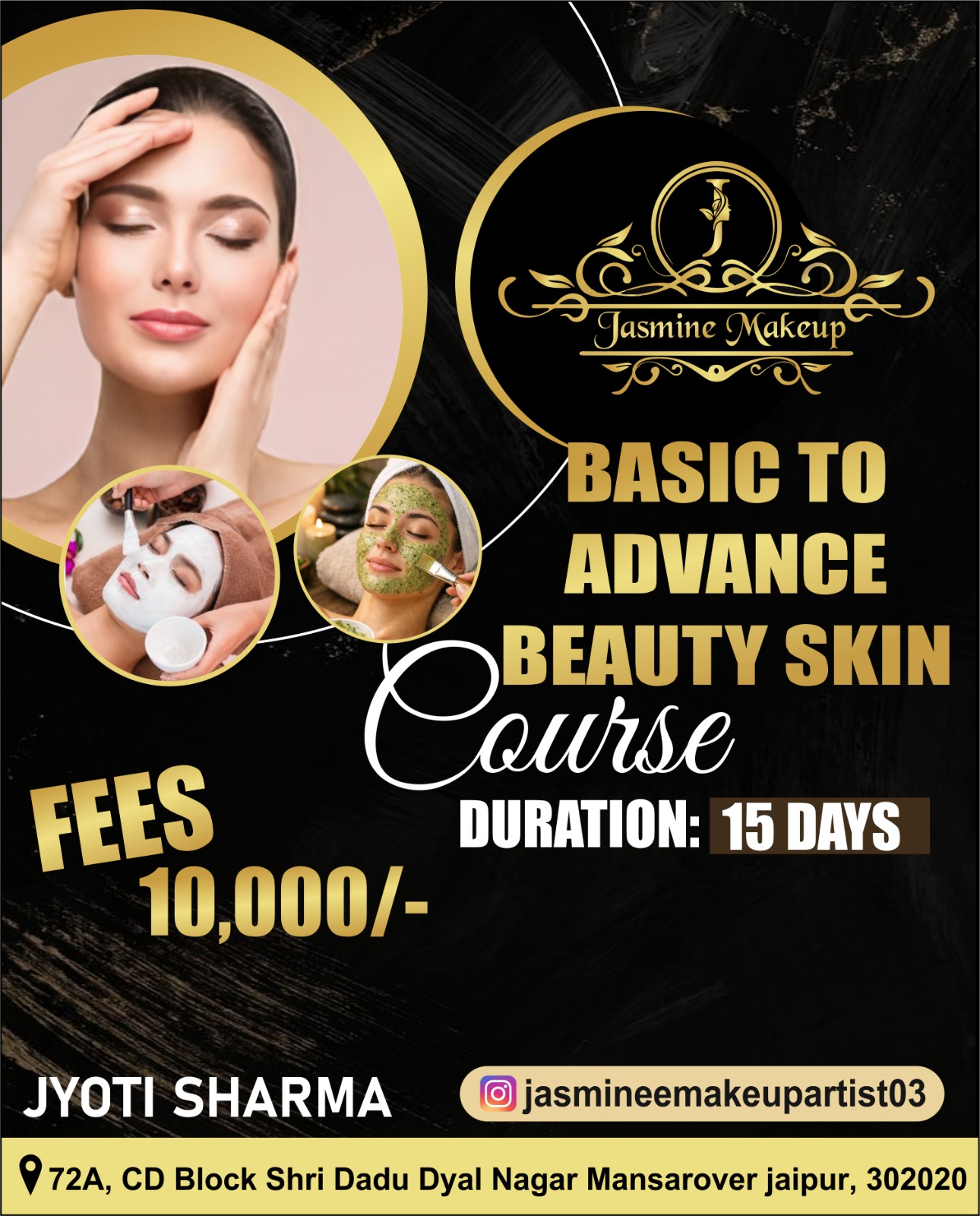 Learn professional skincare in our 15-day intensive course at Jasmine Makeup Over and Academy, Jaipur. Master skin types, facials, advanced treatments, client consultation, and use of skincare tools through hands-on practical training. Expert guidance by Jyoti Sharma helps you become a certified beauty professional.