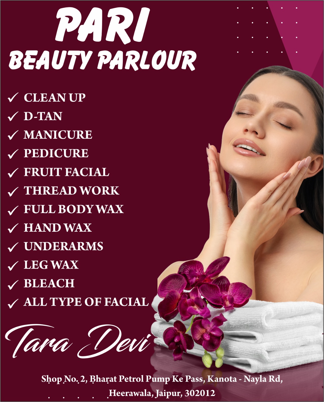 Get a stylish, smooth, and healthy hair transformation at Pari Beauty Parlour, Kanota (Jaipur) by expert artist Tara Devi. We specialize in Basic & Advanced Haircuts, professional Hair Wash & Blow Dry, Global Hair Color, Highlights, and advanced treatments like Keratin, Botox, and Hair Spa to nourish, repair, and strengthen your hair. Using quality products and modern techniques, we ensure shiny, manageable, and long-lasting results that perfectly enhance your overall look.