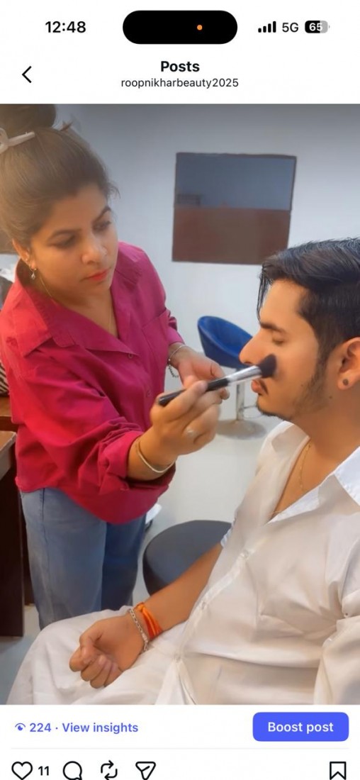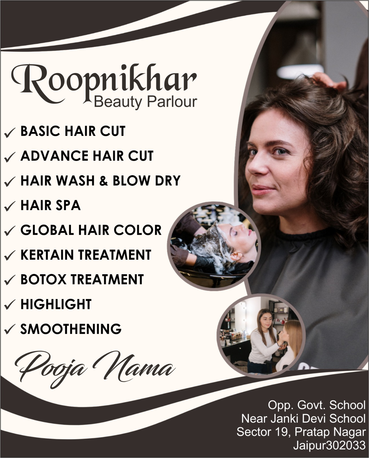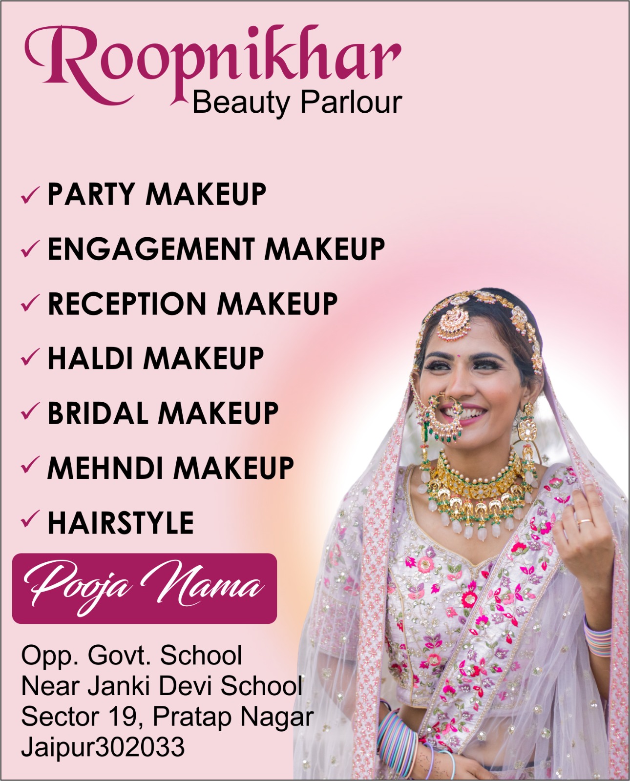 Roopnikhar Beauty Parlour, located in Pratap Nagar, Jaipur, offers expert Bridal, Engagement, Haldi, Reception, and Party Makeup services by professional makeup artist Pooja Nama. We create flawless, long-lasting, and customized makeup looks for every special occasion, enhancing your natural beauty. Professional hairstyling services are also provided to complete your perfect look.