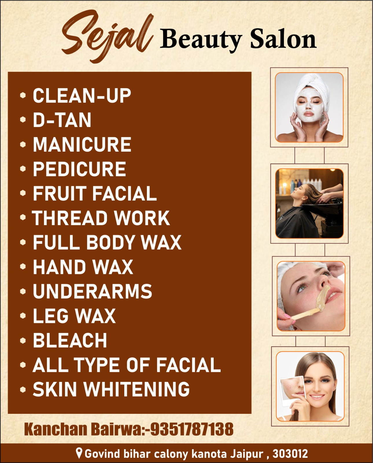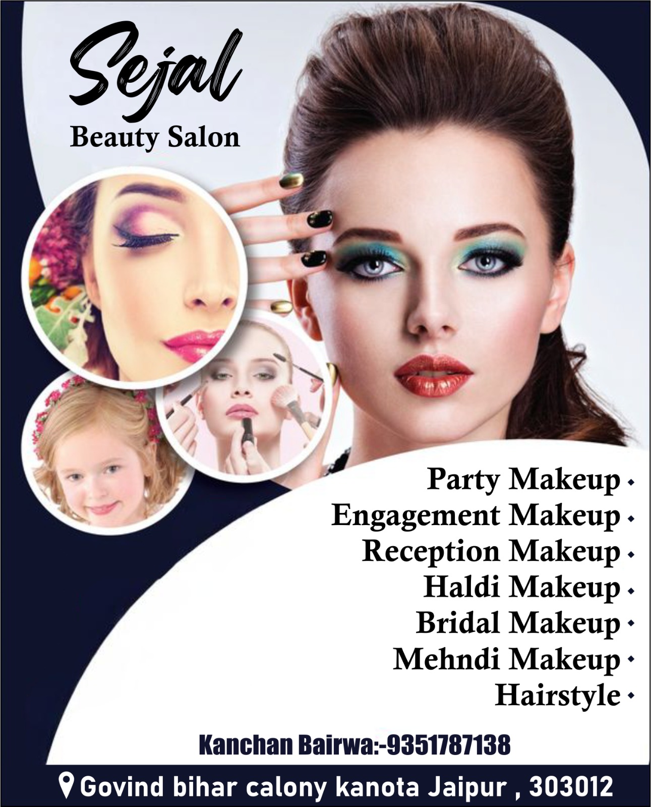 Get a flawless and stunning look at Sejal Beauty Salon, Kanota (Jaipur) by expert makeup artist Kanchan Bairwa. We specialize in Bridal Makeup for long-lasting perfection, Engagement & Reception Makeup for elegant looks, Haldi & Mehndi Makeup for fresh and vibrant styles, Party Makeup for all occasions, and advanced Hairstyling to perfectly match your outfit. Using top-quality products and the latest techniques, we ensure radiant, camera-ready results that enhance your natural beauty and boost your confidence for every special moment.