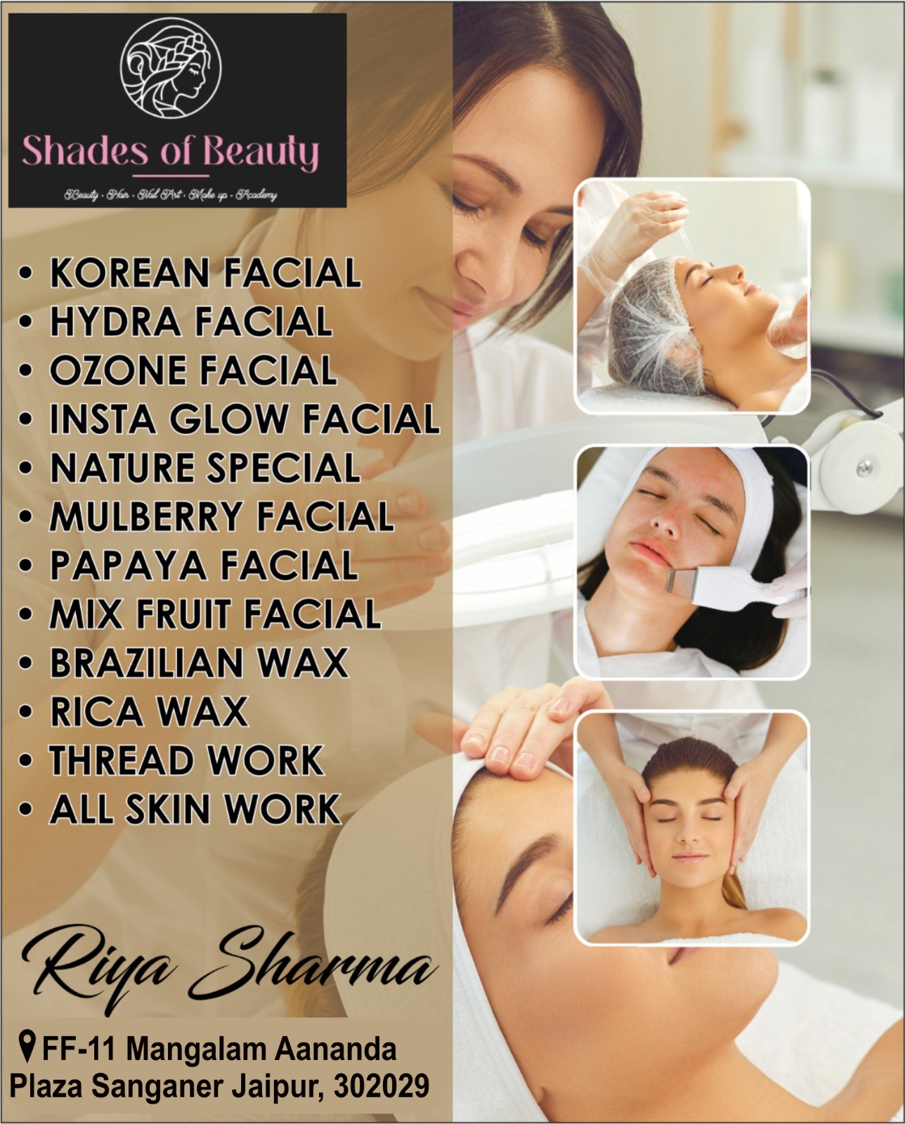 Shades of Beauty by Riya Sharma is a trusted and top-rated beauty salon in Sanganer, Jaipur, offering complete makeup, hair, and skincare services under one roof. From Bridal Makeup, HD Makeup, and party looks to advanced hair treatments like Keratin, Botox, smoothening, and global hair color, we ensure a flawless and modern look for every client. Our premium facials including Hydra Facial, Korean Facial, and Insta Glow Facial help you achieve healthy, radiant skin.