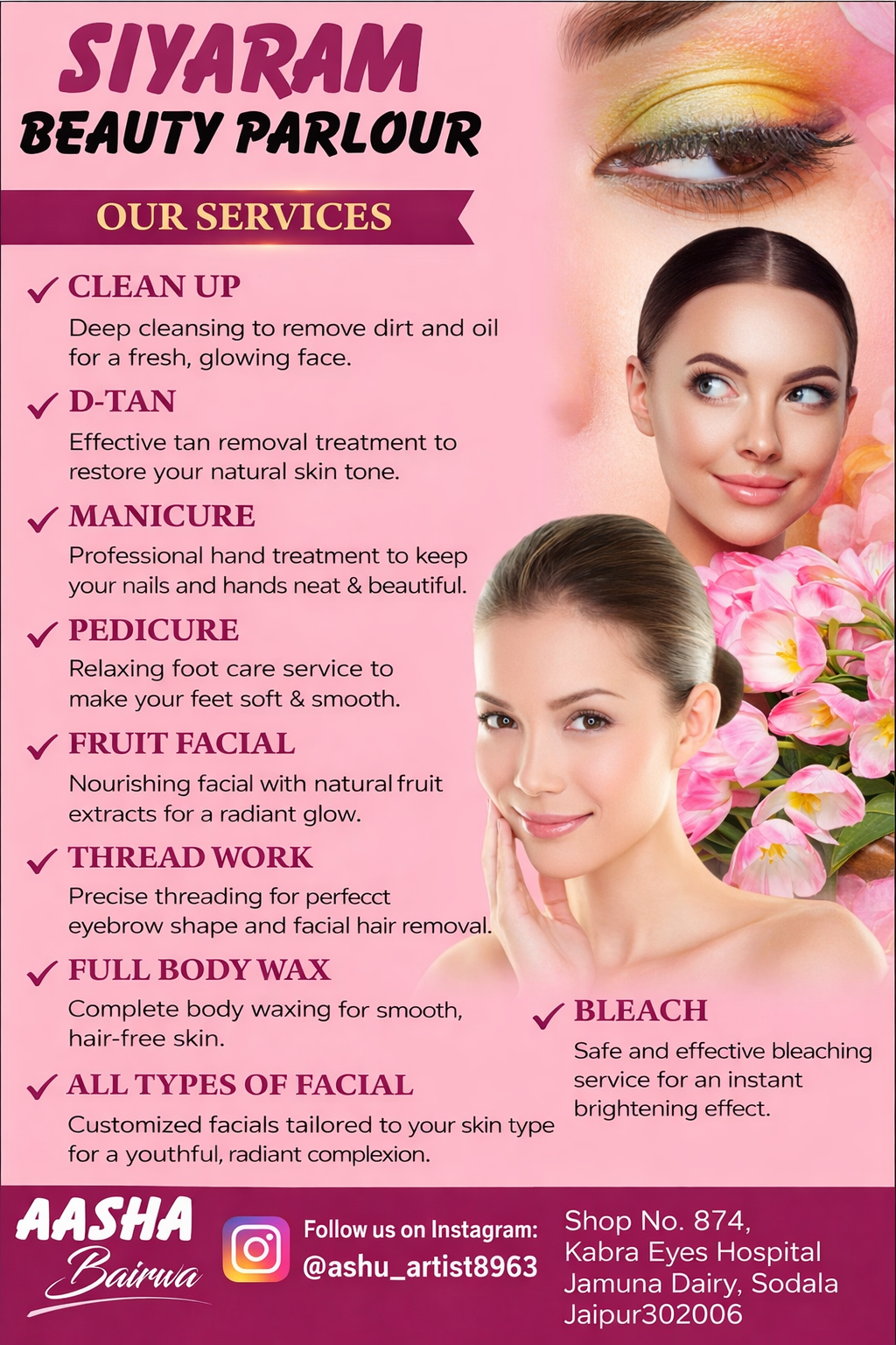 Led by expert makeup artist Aasha Bairwa, we offer professional and personalized beauty services to enhance your natural glow.