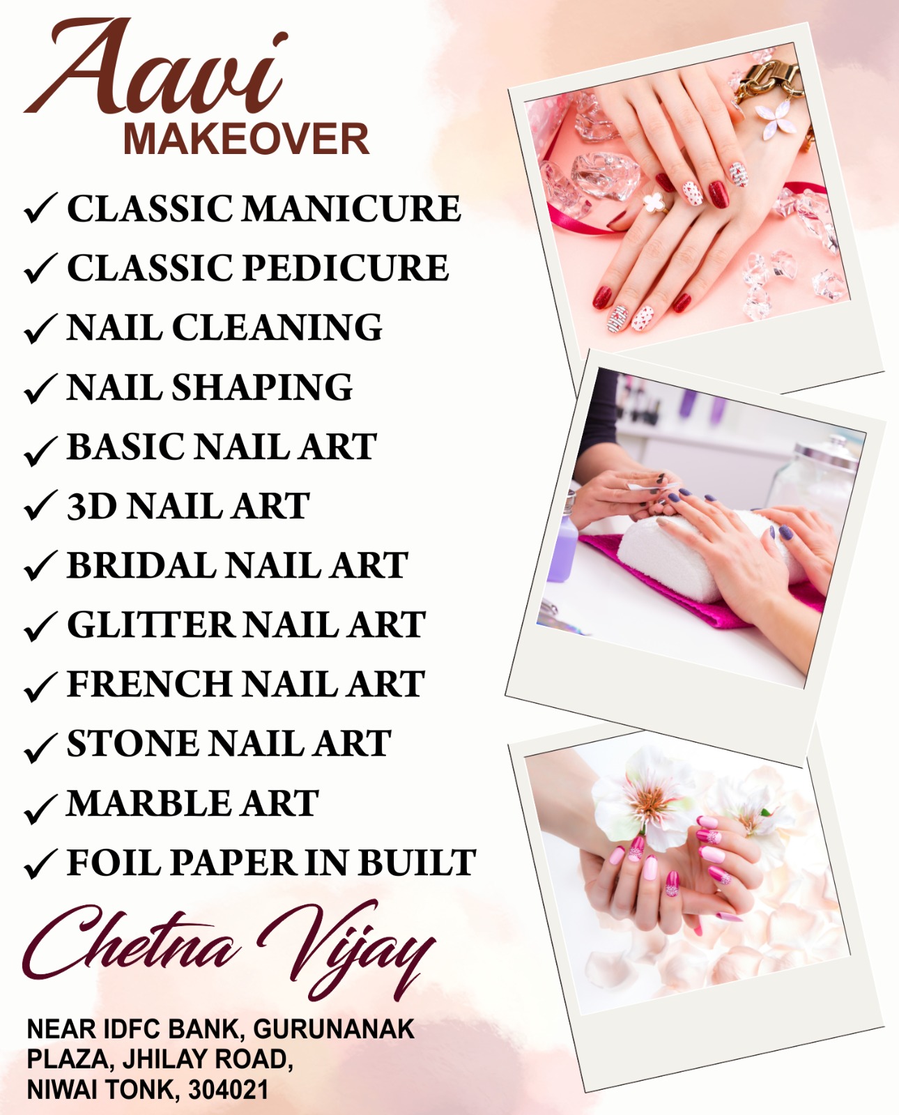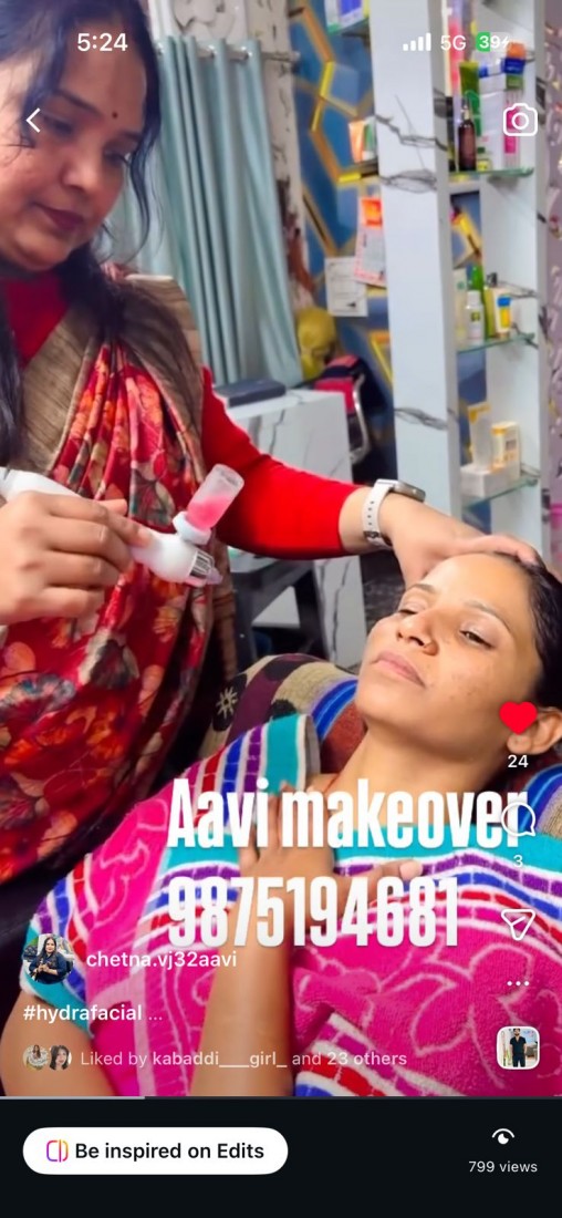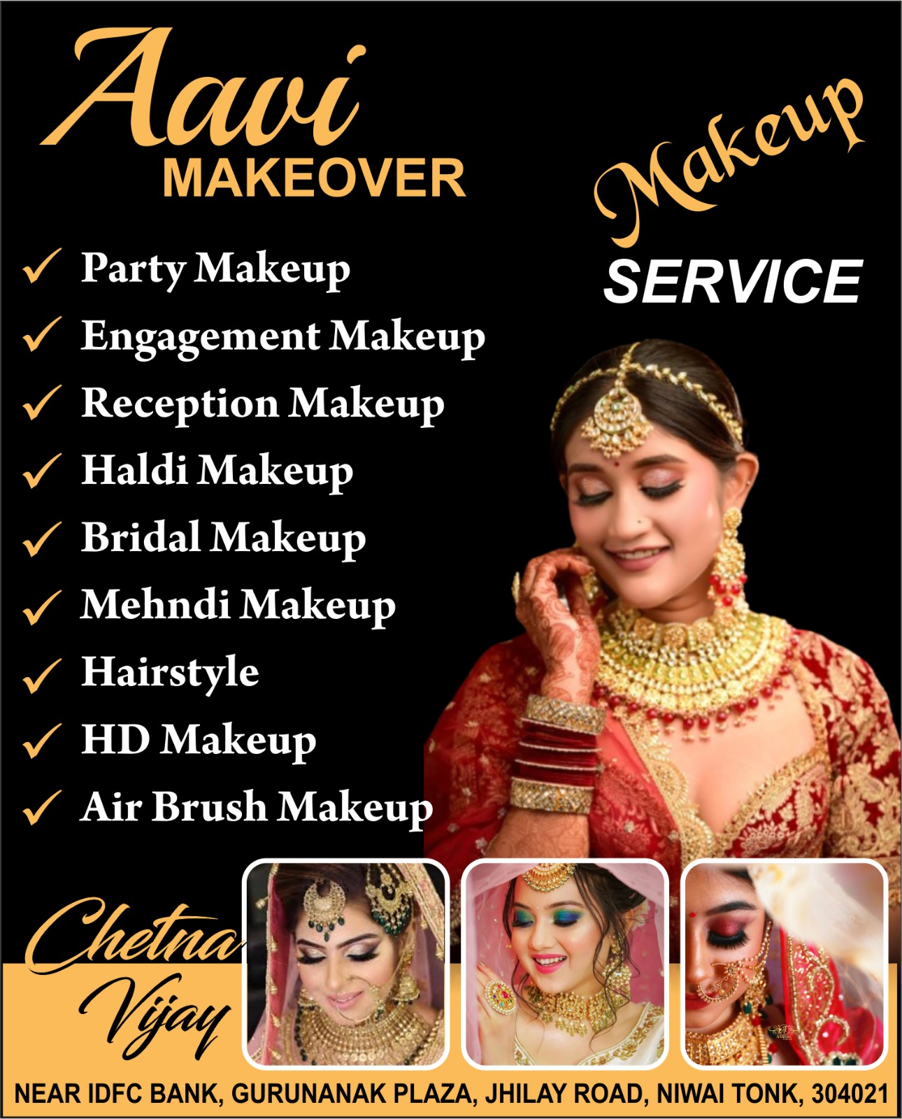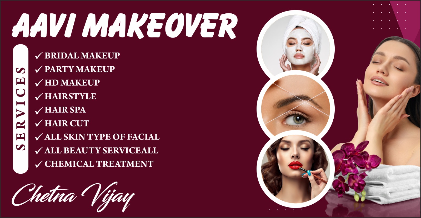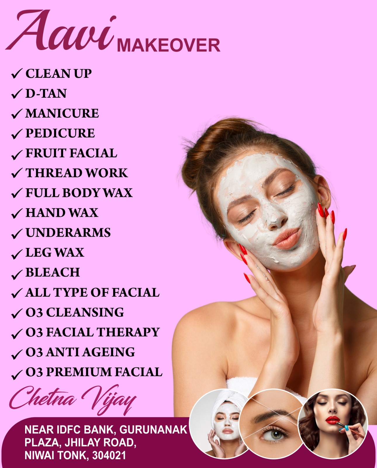 About us : Aavi Makeover is dedicated to enhancing your natural beauty with professional care and quality beauty services. We offer a range of services including Makeup, Hair, Skin, Chemical Treatment, Nail Art, Hydra Facial, Korean Facial, Air Brush Makeup to help you look and feel your best. Our focus is on providing a relaxing environment, expert service, and the best beauty experience for every client