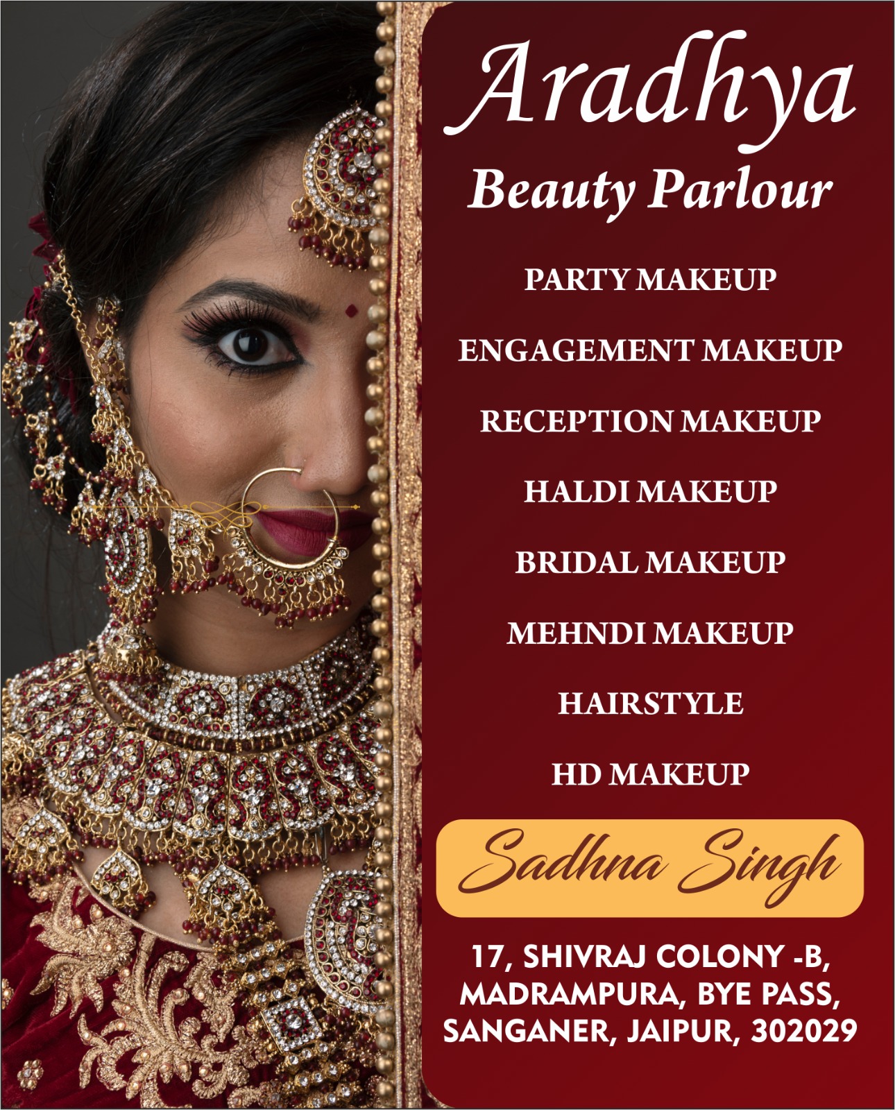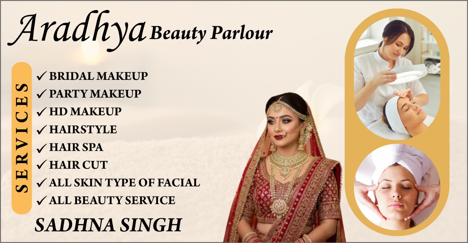 At Aradhya Beauty Parlour, led by Certified Makeup Artist Sadhna Singh, we provide professional beauty services with a strong focus on quality, hygiene, and client satisfaction. Our aim is to enhance your natural beauty and give you a confident, elegant look for every special occasion.