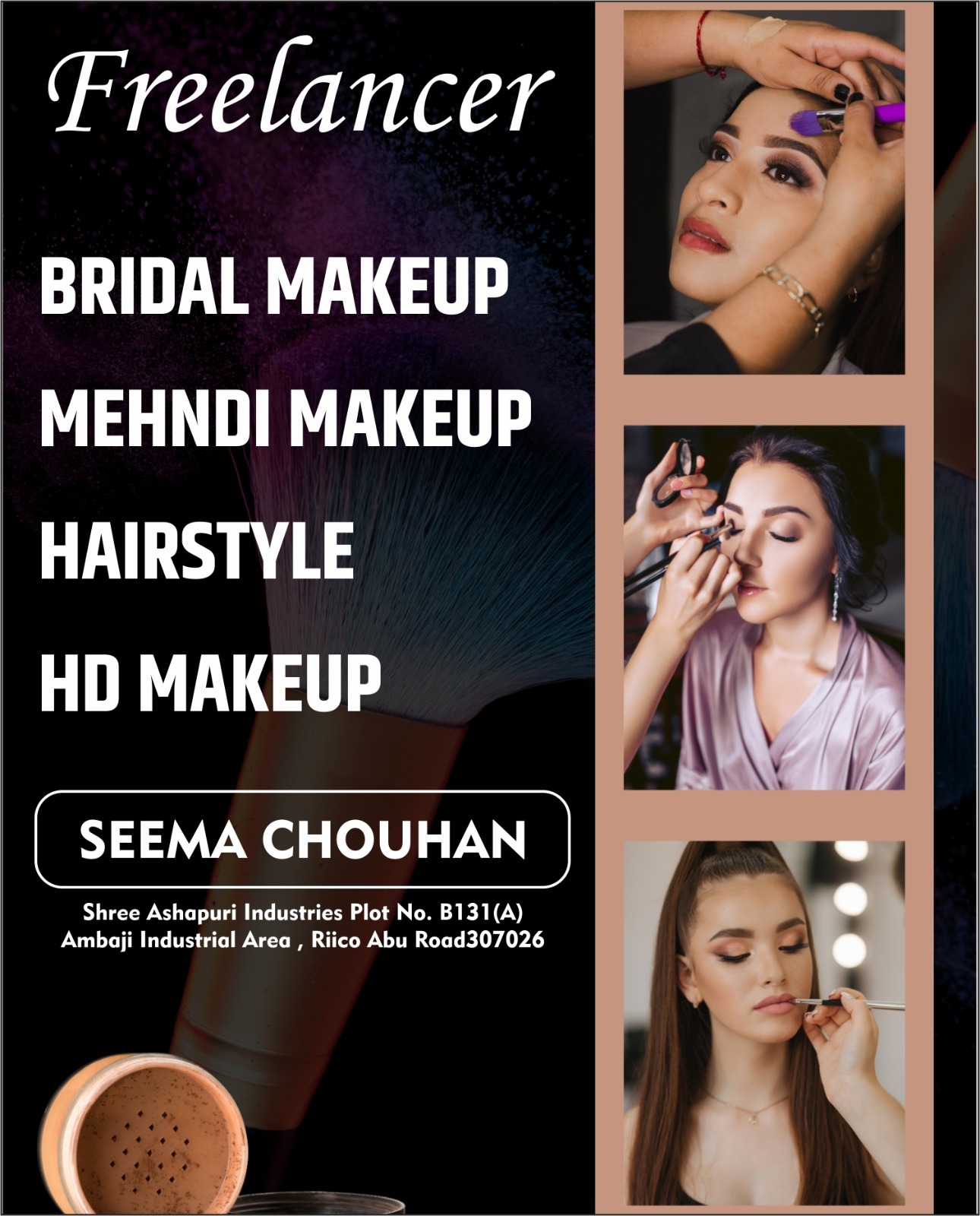 Seema Chouhan offers professional freelance makeup services for all special occasions in Abu Road, Rajasthan. We specialize in Bridal Makeup, Mehndi Makeup, HD Makeup, and Hairstyling to create a flawless and elegant look. Each makeup is fully customized according to your skin type, face features, and event requirement to ensure a natural, long-lasting, and camera-ready finish. Our focus is on providing premium, personalized beauty services that enhance your confidence and natural charm for your most special moments.