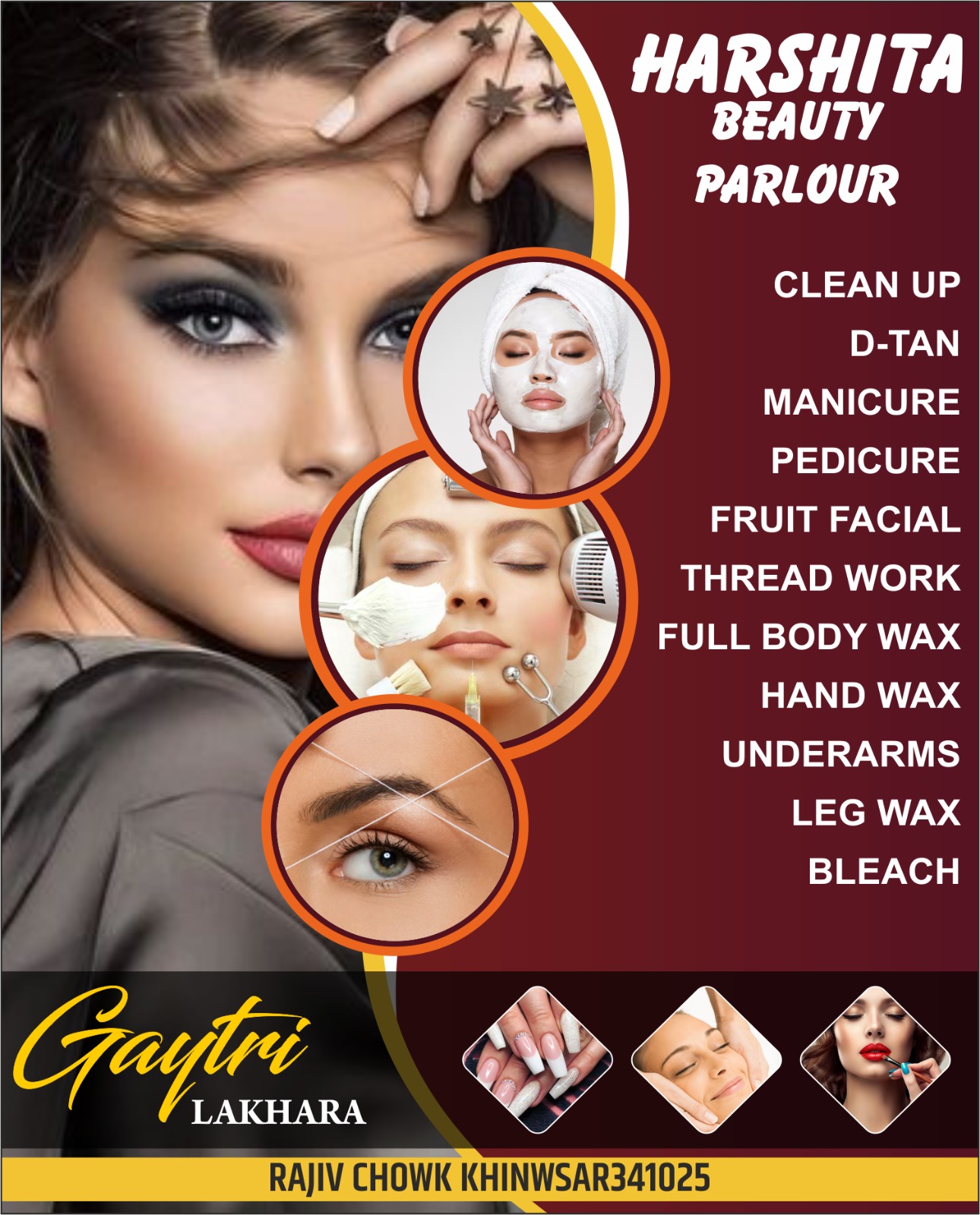 About Us: At Harshita Beauty Parlour, Khinwsar, we offer professional beauty and hair services to help you achieve a flawless and confident look for every occasion. Led by expert makeup artist Gaytri Lakhara, we specialize in Bridal Makeup, HD Makeup, Party Makeup, and pre-wedding looks including Engagement, Haldi, and Mehndi Makeup. Our services also include advanced Hair Care such as Basic & Advance Haircuts, Hair Wash & Blow Dry, Hair Spa, and Keratin treatments for smooth and healthy hair. We provide complete Skin Care services including D-Tan, Fruit Facials, Clean-ups, and Bleach along with Grooming services like Threading, Manicure, Pedicure, and Full Body Waxing. Located at Rajiv Chowk, Khinwsar, we focus on quality service, hygiene, and customer satisfaction to deliver the best salon experience.