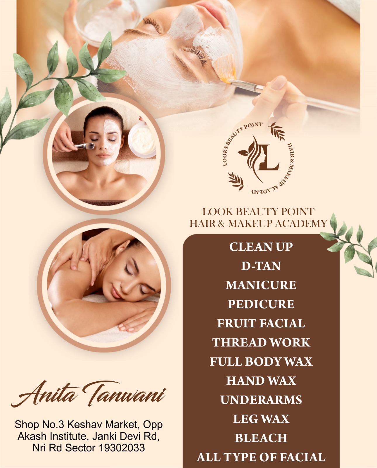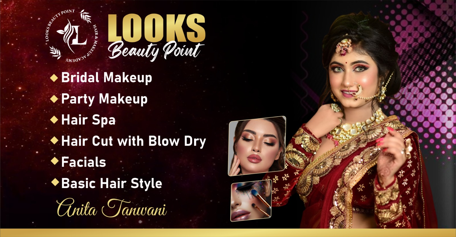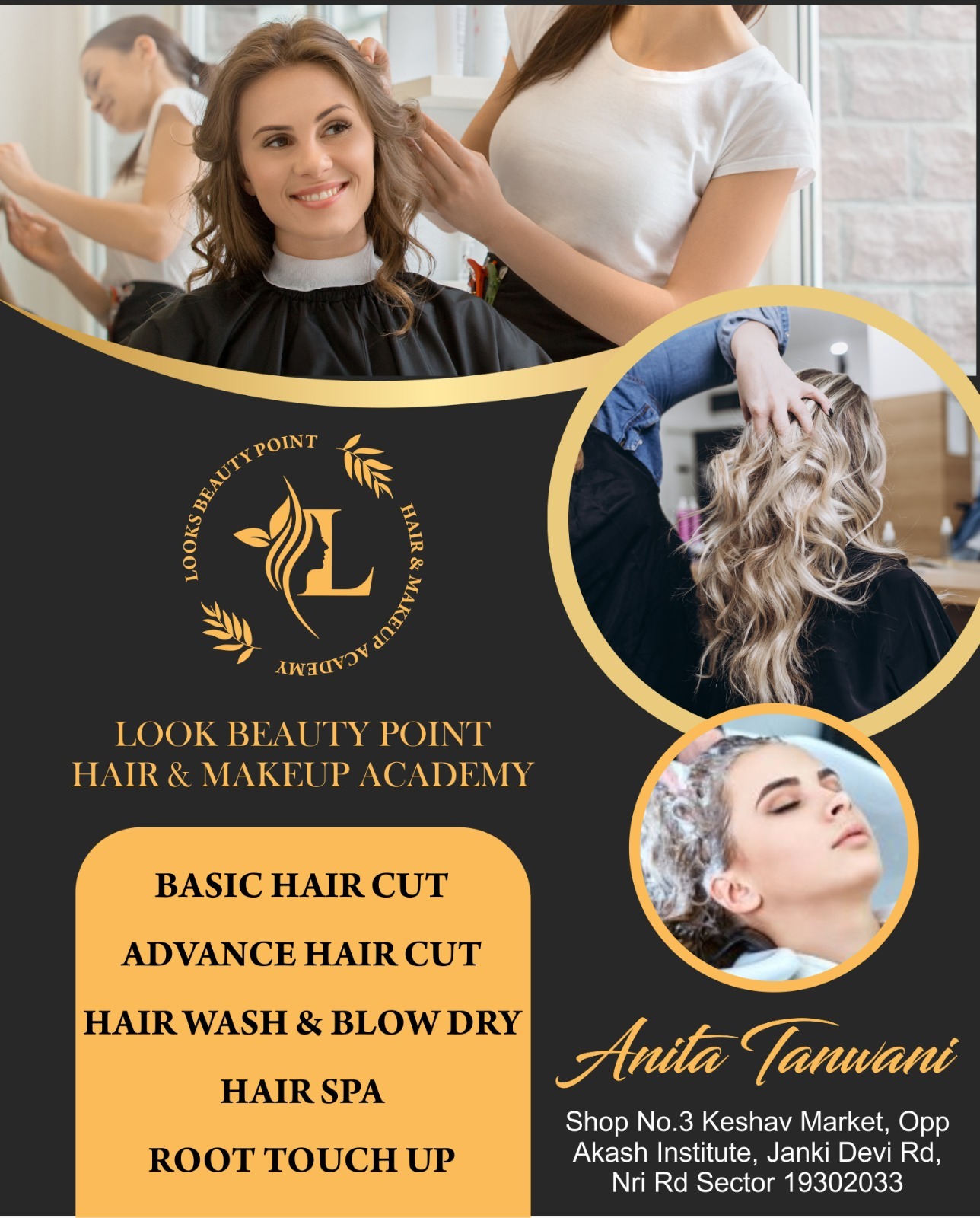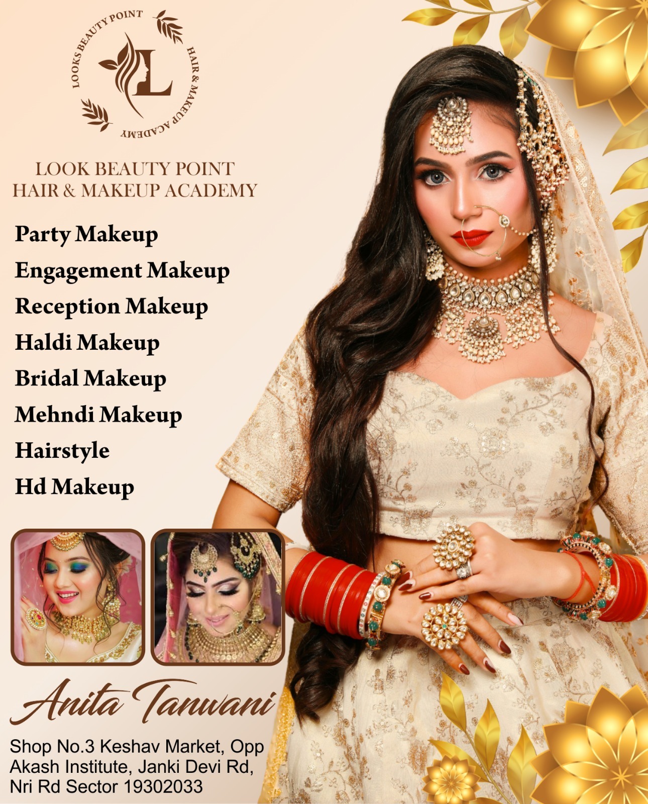 Look Beauty Point Hair & Makeup Academy, located in NRI Road Sector, offers expert Bridal Makeup, Engagement Makeup, Reception Makeup, HD Makeup, Haircuts, Hair Spa, and Skin Care services. With 16+ years of experience, Anita Tanwani uses premium products and professional techniques to give you a flawless and long-lasting look.