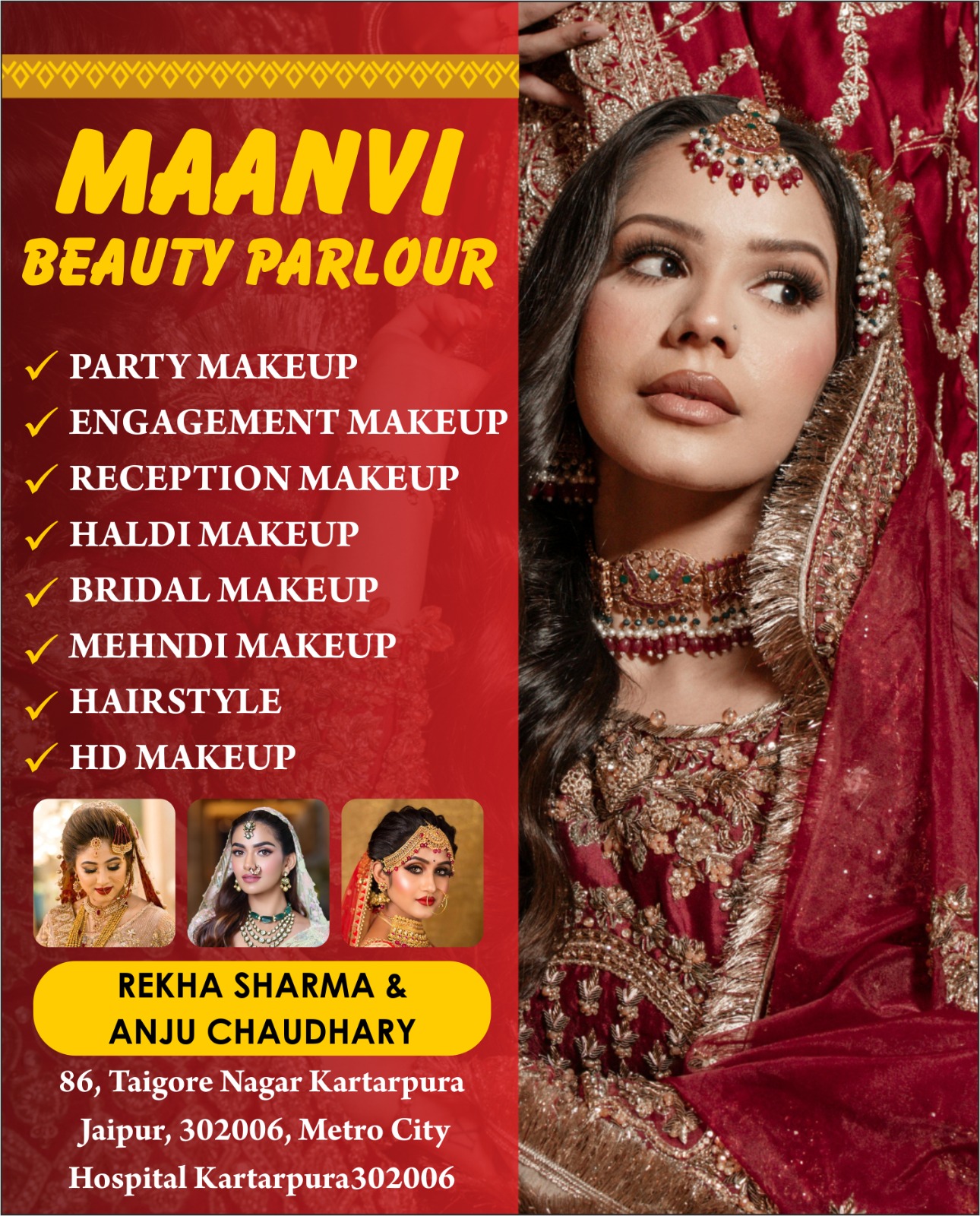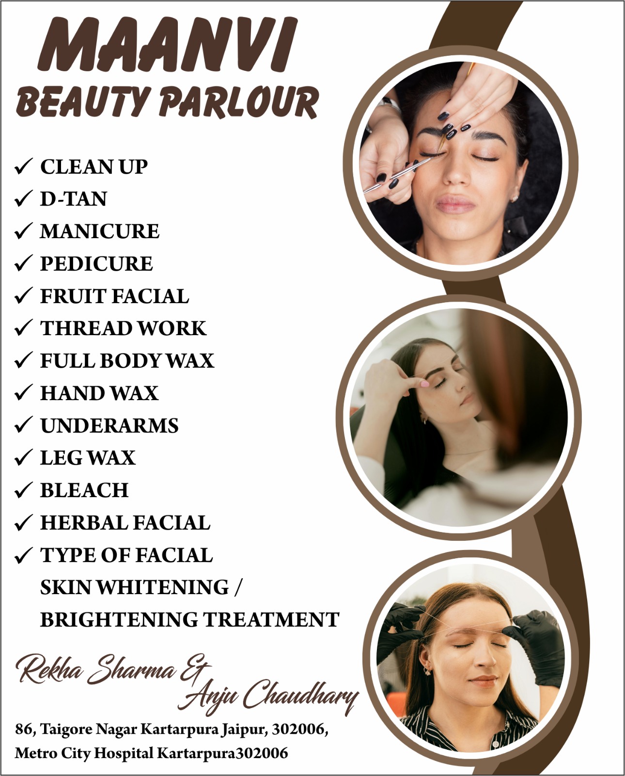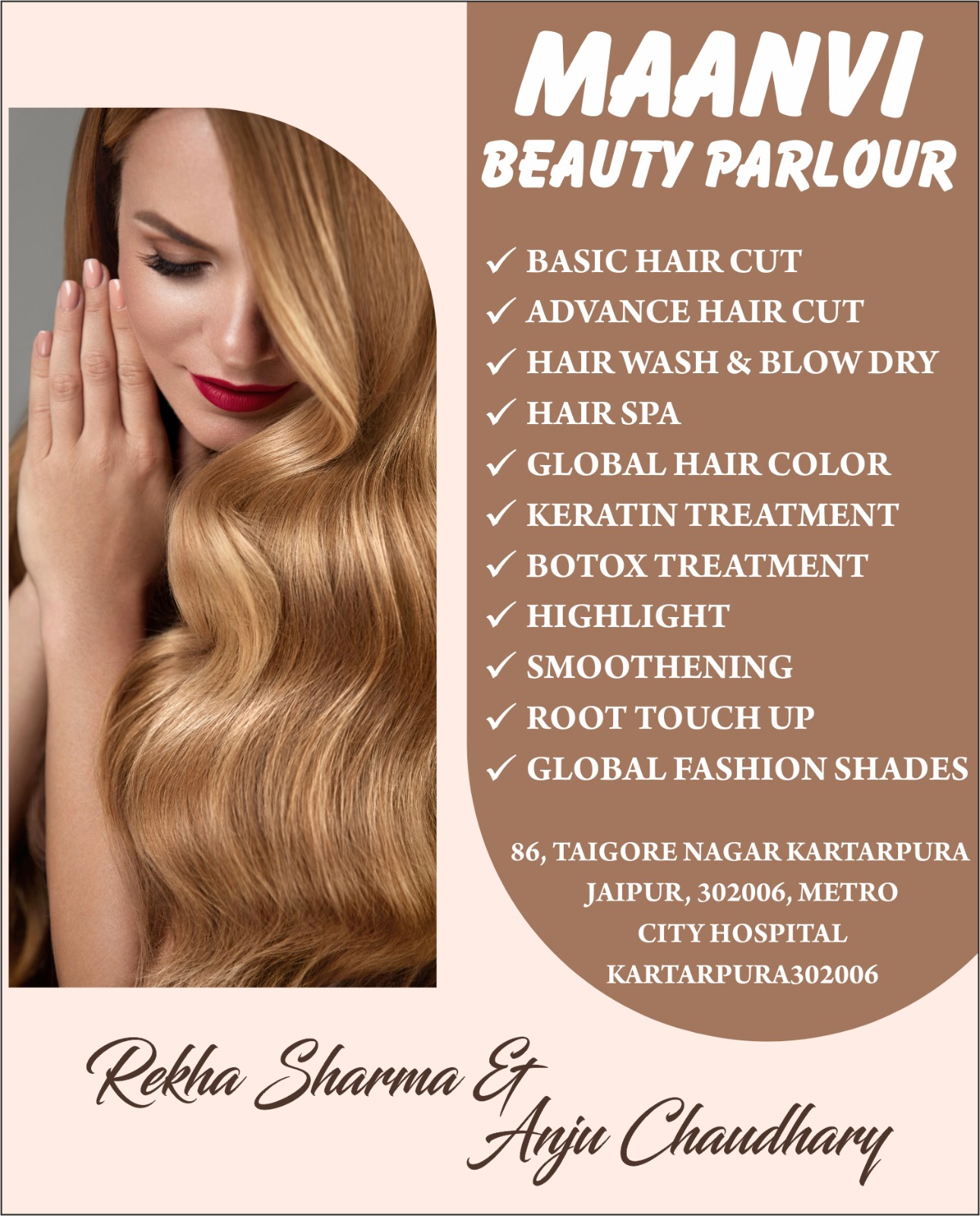 Get a glamorous and healthy hair transformation at Maanvi Beauty Parlour by Rekha Sharma & Anju Chaudhary. We specialize in expert Haircuts & Styling including basic and advanced cuts, Hair Wash & Blow Dry, deep nourishing Hair Spa, professional services like Global Hair Color, Fashion Shades, Highlights, Root Touch Ups, and advanced chemical treatments such as Keratin, Botox, and Smoothening to keep your hair shiny, smooth, and manageable. Using modern techniques and quality products, we ensure stylish and long-lasting results.
