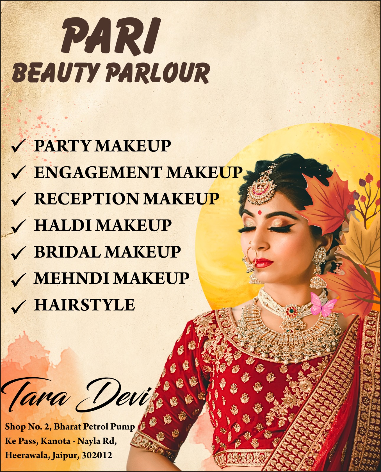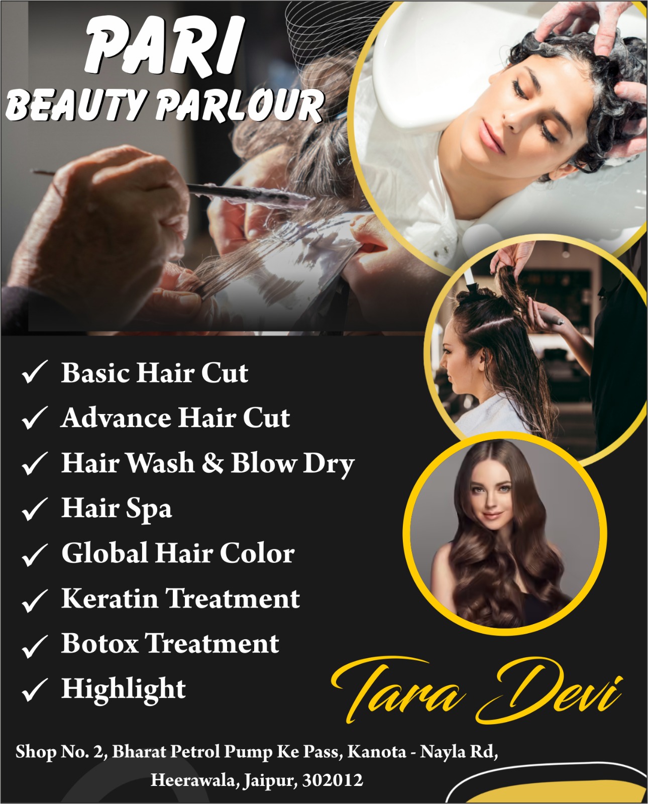 Get a stylish, smooth, and healthy hair transformation at Pari Beauty Parlour, Kanota (Jaipur) by expert artist Tara Devi. We specialize in Basic & Advanced Haircuts, professional Hair Wash & Blow Dry, Global Hair Color, Highlights, and advanced treatments like Keratin, Botox, and Hair Spa to nourish, repair, and strengthen your hair. Using quality products and modern techniques, we ensure shiny, manageable, and long-lasting results that perfectly enhance your overall look.