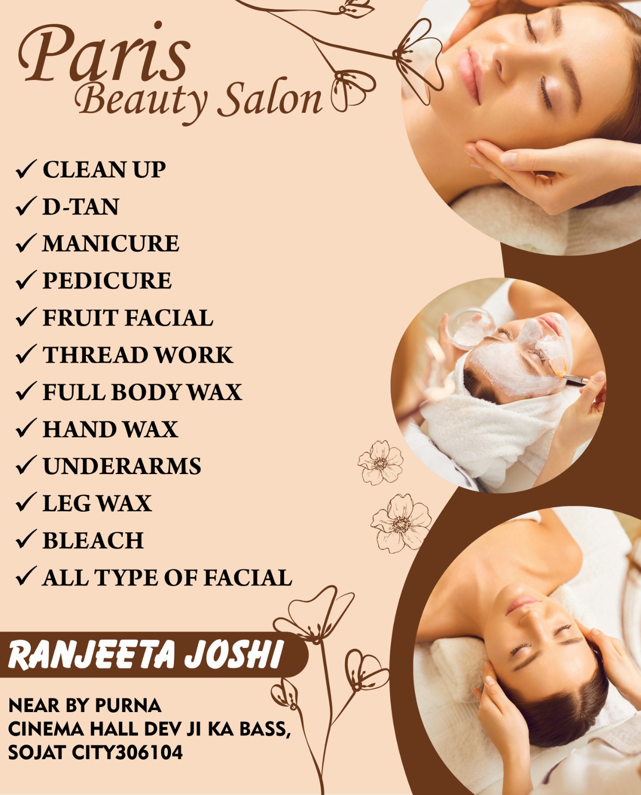Paris Beauty Salon provides complete skin care and body grooming services to enhance your natural beauty. We offer Fruit Facials and Premium Facials for instant glow, along with Full Body, Hand & Leg Waxing for smooth and soft skin. Our services also include D-Tan Treatment to remove sun tan and improve skin tone, as well as Manicure & Pedicure for complete hand and foot care and relaxation.
