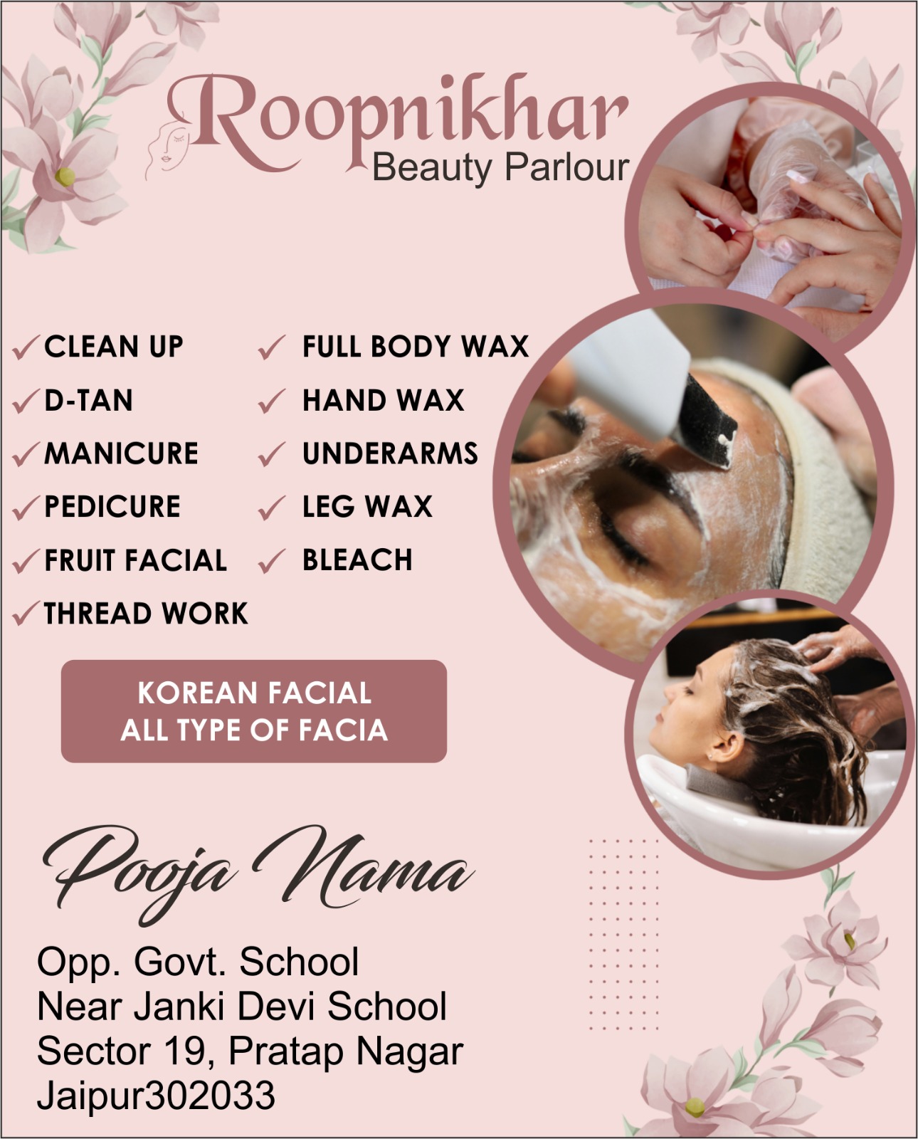 Roopnikhar Beauty Parlour, located in Pratap Nagar, Jaipur, offers expert Bridal, Engagement, Haldi, Reception, and Party Makeup services by professional makeup artist Pooja Nama. We create flawless, long-lasting, and customized makeup looks for every special occasion, enhancing your natural beauty. Professional hairstyling services are also provided to complete your perfect look.