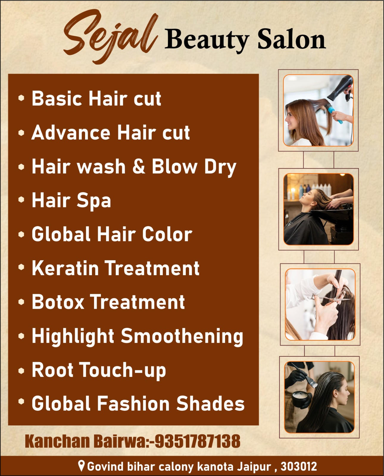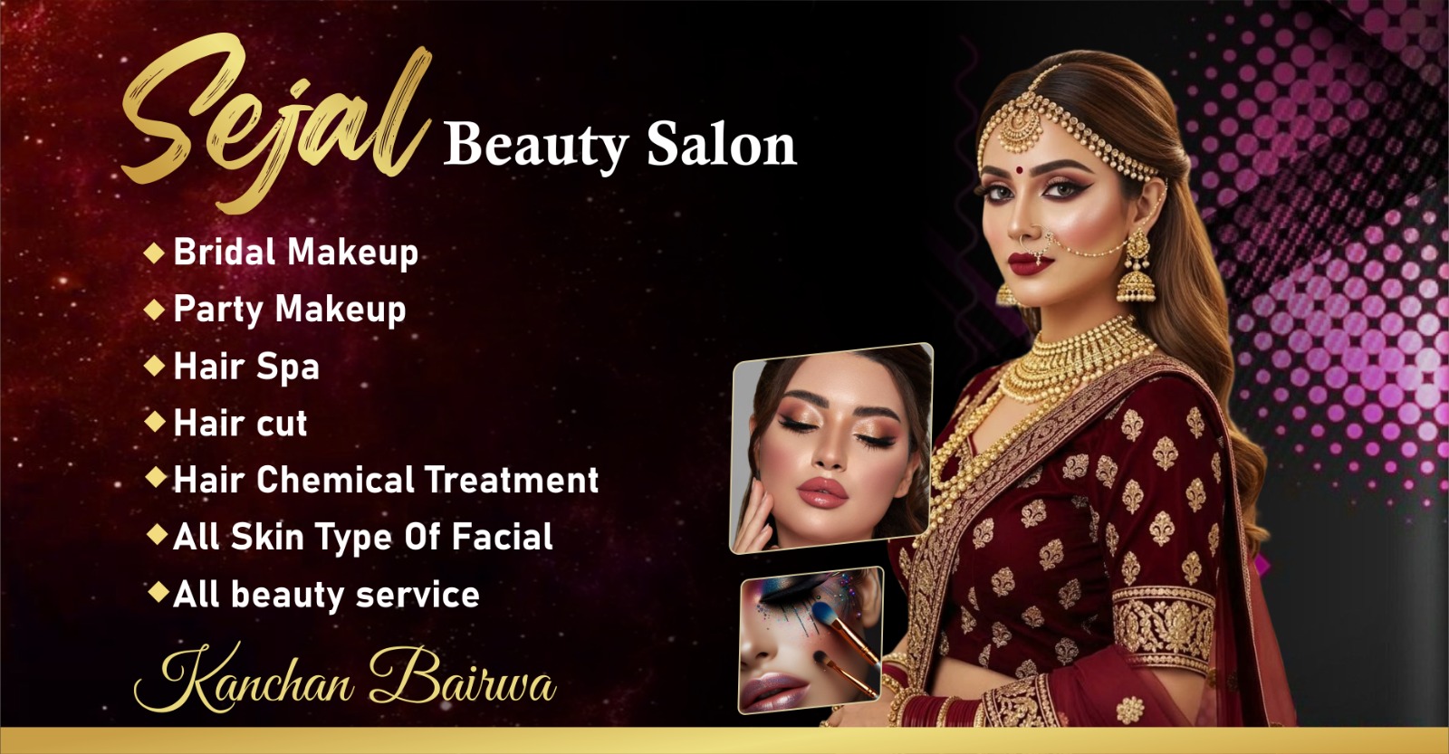 Get a flawless and stunning look at Sejal Beauty Salon, Kanota (Jaipur) by expert makeup artist Kanchan Bairwa. We specialize in Bridal Makeup for long-lasting perfection, Engagement & Reception Makeup for elegant looks, Haldi & Mehndi Makeup for fresh and vibrant styles, Party Makeup for all occasions, and advanced Hairstyling to perfectly match your outfit. Using top-quality products and the latest techniques, we ensure radiant, camera-ready results that enhance your natural beauty and boost your confidence for every special moment.