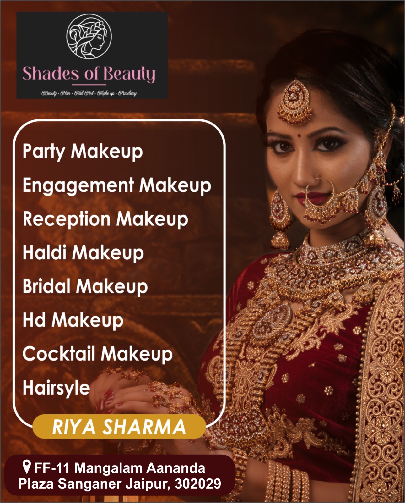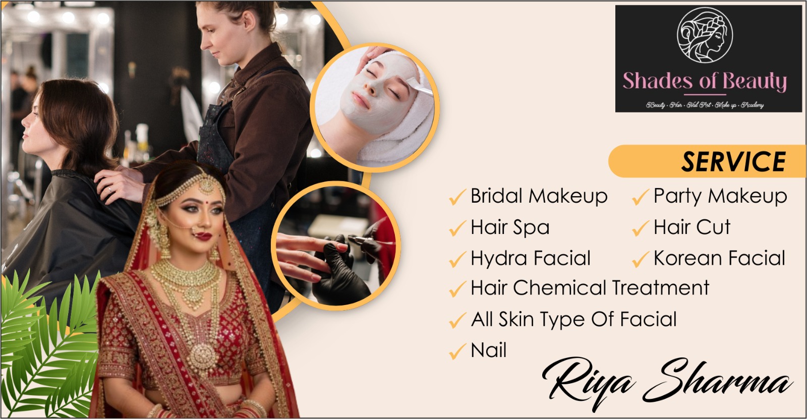 Shades of Beauty by Riya Sharma is a trusted and top-rated beauty salon in Sanganer, Jaipur, offering complete makeup, hair, and skincare services under one roof. From Bridal Makeup, HD Makeup, and party looks to advanced hair treatments like Keratin, Botox, smoothening, and global hair color, we ensure a flawless and modern look for every client. Our premium facials including Hydra Facial, Korean Facial, and Insta Glow Facial help you achieve healthy, radiant skin.